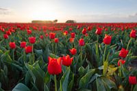 Bloeiende tulpen tijdens zonsondergang in Flevoland. De tulpen groeien in een veld in Oost Flevoland, waar meerdere tulpensoorten geteeld worden.