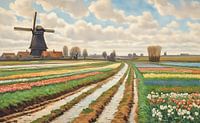 Schilderij in impressionistische stijl van bloeiende tulpenvelden in het westen van Nederland met een historische molen op de achtergrond.