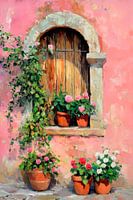 Een zachtroze muur omarmt een nostalgisch raam, omringd door weelderig groen en fleurige bloemen. Bloeiende geraniums in kleipotten voegen een vleugje levendigheid en frisheid toe aan het uitzicht. Het licht speelt zacht op het hout, terwijl de planten het hart raken met hun kleurrijkheid en gratie. Uitnodigend en vol leven!