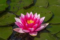 De waterlelie op jouw foto heeft een intens roze bloem met gele meeldraden in het midden. De bladeren op de achtergrond zijn donkergroen en vormen een mooi contrast met de heldere bloem.