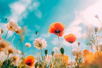 Een helder veld vol kleurrijke bloemen dat de zintuigen betovert en de frisheid van de lente vastlegt. De felrode klaprozen steken fel af tegen de helderblauwe lucht en creëren een sfeer van levensvreugde. Ideaal voor de woonkamer om een warme en uitnodigende sfeer te creëren.