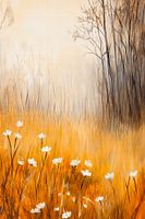 Zachte goud- en crèmetinten versmelten met delicate witte bloemen die bloeien in een rustige weide. De spaarzame bomen op de achtergrond geven het motief een mystieke diepte. Dit schilderij is ideaal voor de woonkamer, creëert een harmonieuze, ontspannen sfeer en nodigt uit om te blijven hangen.