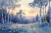 Een zachte ochtend telt de eerste zonnestralen die door de tere berkenbladeren dansen. Een weide vol bloeiende wilde bloemen en een fijne sluier van mist creëren een vredige, harmonieuze sfeer. Dit kunstwerk nodigt uit tot dromen en is perfect voor de slaapkamer of woonkamer, waar rust en ontspanning centraal staan.