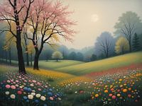 Een betoverende weide, bedekt met een veelheid aan kleurrijke bloemen in volle lente.