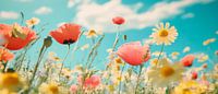 Een harmonieuze zee van kleurrijke bloemen ontvouwt zich onder een helderblauwe hemel. De heldere klaprozen en vrolijke madeliefjes dansen in de zachte bries en verspreiden een sfeer van frisheid en levensvreugde. Dit kunstwerk geeft een uitnodigend en vrolijk tintje aan elke woonkamer, ideaal voor ontspannende momenten.