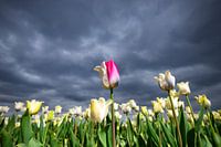 Veld met bloeiende witte tulpen en één roze tulp met donkere onweerswolken in de achtergrond tijdens de lente in Nederland. De tulpen groeien in een veld in Flevoland.