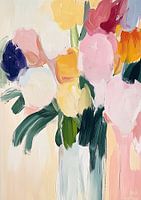 Abstract bloemenschilderij met krachtige penseelstreken van bloemen in een vaas. Het kleurenpalet bestaat uit roze, geel, groen en blauw, waarmee een lentethema wordt weergegeven in een moderne kunststijl. De eenvoudige compositie is geplaatst tegen een witte achtergrond met een licht pastelkleurenpalet, waardoor een heldere en vrolijke stemming ontstaat. De hoge-resolutie close-up benadrukt de levendige en levendige aard van het kunstwerk.