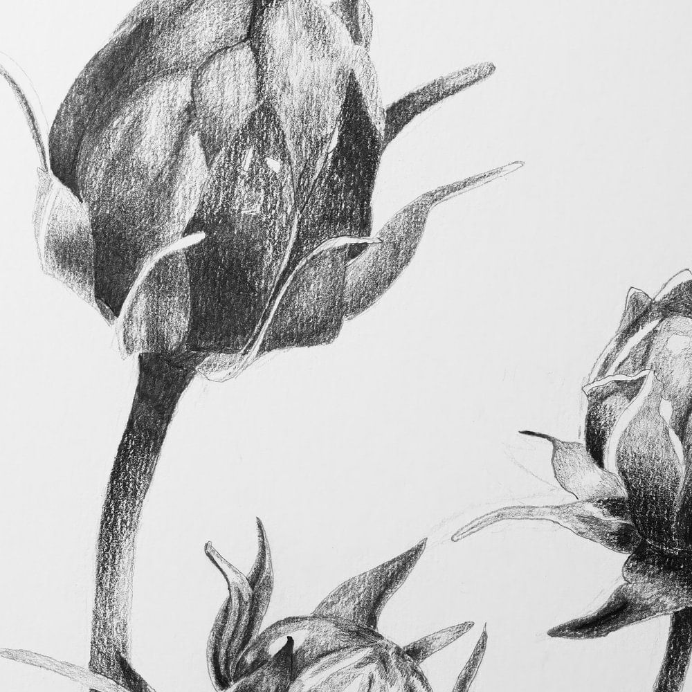 Deze tekening in potlood maakt deel uit van een serie tekeningen. Mijn inspiratie hiervoor was een Cosmea plant die midden in de zomer volop in bloei stond maar tegelijk ook uitgebloeide bloemen toonde. Daarnaast zaten er nog veel knoppen in waarvan er een aantal op uitlopen stonden. Overigens een dankbare plant ook tijdens warme en droge zomers. Ik koos voor een compositie waarbij de nadruk ligt op de bloemknoppen. De achtergrond vulde ik daarom niet in. Door alleen in zwart-wit te werken gaat de aandacht nog meer naar de vormen van de bloemknoppen.