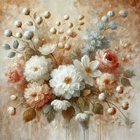 Een dromerig bloemstilleven met zachte tinten van wit, perzik en lichtblauw. De volle bloemen en subtiele penseelstreken geven het schilderij een warme, bijna poëtische uitstraling. Ideaal voor een romantisch interieur of een klassieke woonkamer waar kunst en sfeer samenkomen.