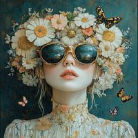 Bloem Vrouw - Dit is een bloemen schilderij van een jonge vrouw versierd met een weelderige bloemenkrans en vlinders om haar hoofd, waarbij de grote zonnebril en zachte bloemblaadjes een speelse maar mysterieuze uitstraling geven.