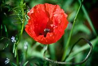 Een prachtige klaproos kronkelt omhoog uit het groene landschap.