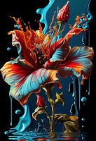 Een schitterende bloem, acryl verf, water en een onbekend element genaamd Floetrol. De belichting is steeds anders. Verf spatterd er vanaf.