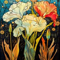 Dit kunstwerk is geïnspireerd op de Jugendstil-stijl en biedt een prachtige weergave van een bloemencompositie. De afbeelding combineert organische vormen en vloeiende lijnen, kenmerkend voor deze artistieke stroming. Het werk is perfect voor liefhebbers van klassieke kunst en natuur. Of het nu in een woonkamer, kantoor of hal wordt geplaatst, dit kunstwerk voegt een vleugje tijdloze elegantie en artistieke flair toe aan de ruimte. De Jugendstil-invloed zorgt voor een unieke, decoratieve uitstraling die zowel in moderne als traditionele settings tot zijn recht komt.