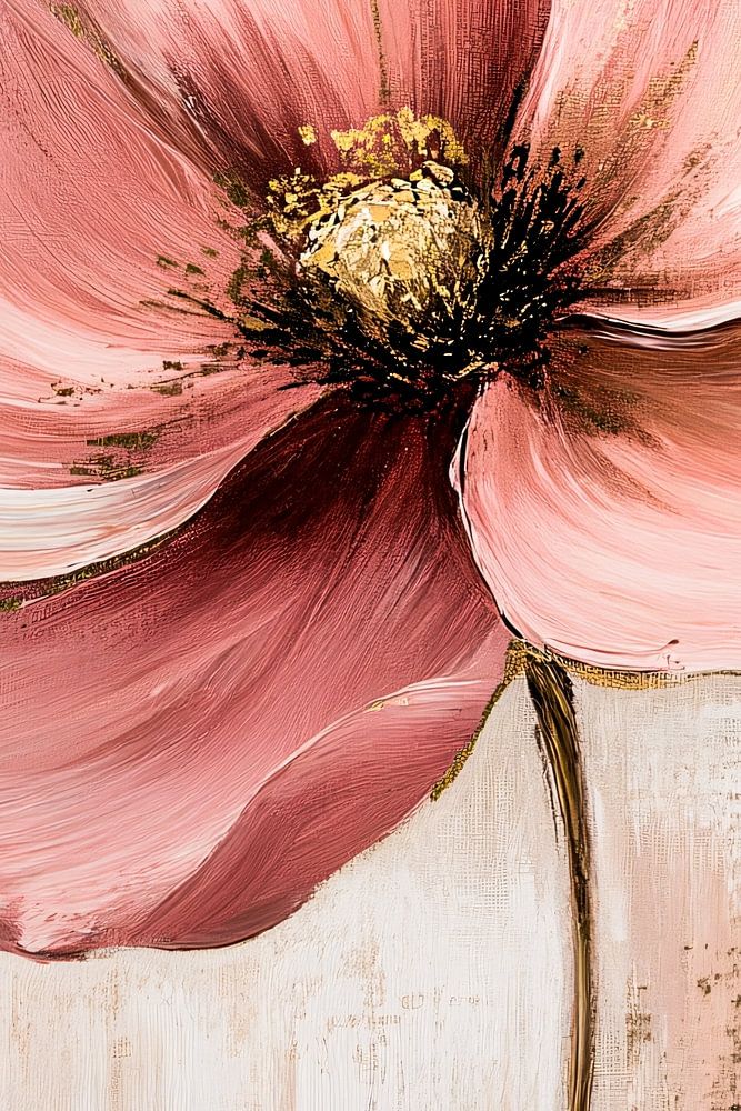 Een prachtige abstracte weergave van een enkele bloem in zachte roze tinten, afgewerkt met luxueuze gouden accenten. Het ontwerp straalt elegantie en verfijning uit en is een perfecte aanvulling op een modern interieur. Ideaal voor liefhebbers van kunst en natuur, dit schilderij brengt een vleugje luxe en sereniteit in elke ruimte.
