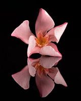 Een close-up foto van de de mooie roze Nerium Oleander of Oleander. Pas in close-up zie je hoe mooi en gedaileerd de bloem is. De foto is gemaakt tegen een zwarte achtergrond en op een spiegelende zwarte plaat. Hierdoor is er een foto ontstaan die heel mooi zal staan op een donkere muur, maar uiteraard is het ook toepaspaar op een hele licht muur.