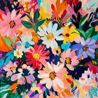 Dit kunstwerk is een levendig abstract bloemenschilderij dat barst van de dynamische kleuren en krachtige penseelstreken. Het toont een reeks bloemen, waaronder madeliefjes en andere bloemen in roze, rode, gele, blauwe en witte tinten, omringd door weelderig groen gebladerte. Warme en koele tinten vermengen zich op de achtergrond en creëren diepte en beweging. De energieke compositie benadrukt een vrolijke, levendige sfeer en legt de essentie van een bloeiende tuin vast.