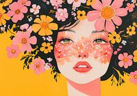 Een betoverende close-up van een vrouw met diepzwarte haren, waarin zachte bloemen lijken te bloeien alsof ze daar van nature thuishoren. Roze en gele bloemblaadjes vlechten zich door haar lokken, hun fragiele randjes donker als inkt, versmeltend met de glans van haar haar. De achtergrond is een diepe, warme geeltint — bijna als vloeibaar zonlicht — die de scène baadt in een gevoel van zinderende vreugde, maar ook een ongrijpbare melancholie.