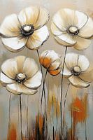 Bloemen Abstract | Soft Whispers of Spring - Dit bloemen schilderij toont grote, gestileerde witte bloemen met zwarte en gouden centra, geschilderd tegen een abstracte achtergrond van zachte beige, bruine en oranje tinten.