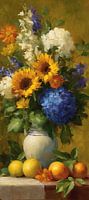 Bloemen Arrangement | Bloemen in Vaas met Fruit - Op dit bloemen schilderij zie je een arrangement van kleurrijke bloemen, zoals zonnebloemen en een grote blauwe hortensia, met op de voorgrond sappige citrusvruchten, wat het een vrolijke uitstraling geeft.