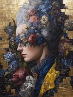Naast de bloemen domineert het gebruik van goud — niet als een dun, vlak blad, maar als een patchwork van lichtgevende vierkantjes die de achtergrond en delen van het figuur omringen. Die gouden mozaïek is opgebouwd uit kleine, onregelmatige platen die hier en daar los lijken te raken, alsof herinnering en decoratie elkaar aftasten. De goudvlakken zijn dik aangebracht, soms met randen en reliëf, zodat het licht vangt en terugkaatst op een bijna ceremonieel ritme. De combinatie van de zachte, natuurlijke vormen van de bloemen met de strakke geometrie van het goud creëert een spanningsveld: warm, levend bloemrijk portret tegenover koel, eeuwig glanzend goudblad.