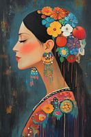 Bloemen | Bloemenvrouw - Op dit vrouwen schilderij zie je een zijprofiel van een vrouw met donker haar, rijk versierd met een kleurrijke bloemen en fruit, en opvallende lange oorbellen, tegen een diepblauwe achtergrond die een gevoel van sereniteit uitstraalt.