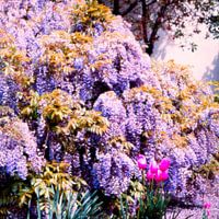 Een schilderij met kleurrijke bloemen in volle pracht verlicht door de zon in zachte kleuren.