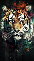 Een betoverende artistieke afbeelding van een tijger. Zijn blik is hypnotiserend, omlijst door weelderige bloemenelementen en vlinders in diep groenblauw en rood. Kleurrijke verfdruppels en een donkere achtergrond geven het een surrealistisch, levendig street art gevoel.
