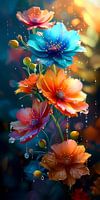 "Dit betoverende digitale schilderij vangt de verbeelding met een weelderige weergave van kleurrijke fantasiebloemen. Elke bloem is doordrenkt met levendige tinten die harmonieus samensmelten en een bruisend palet creëren. Het meest opvallende kenmerk is de speelse weergave van waterdruppels die zachtjes van de bloemblaadjes glijden, waardoor een betoverend schouwspel van lichtreflecties ontstaat. De vloeibare parels benadrukken de frisheid en vitaliteit van de bloemen, waardoor een gevoel van beweging en leven ontstaat in dit kleurrijke en dromerige kunstwerk."