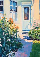 Een olieverfschilderij van de voordeur en de tuin, met lichte pastelkleuren, zachte focus en impressionistische stijl. Zichtbare penseelstreken leggen de scène vast in helder zonlicht op een zonnige dag. De scène bevat bloemen die bloeien voor de bloembakken van het huis en creëert een uitnodigende sfeer met warme tinten.