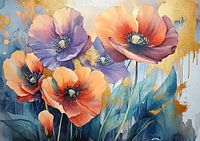 Bloemen Goud | Golden Bloom - Dit bloemenschilderij toont een levendige verzameling van grote, kleurrijke bloemen met gouden accenten tegen een abstract blauwe en grijze achtergrond, waarbij de textuur en kleur-variaties de bloemen tot leven brengen.