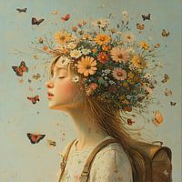 Bloemen Hoofd - Dit is een vrouwen schilderij waar een jonge vrouw met gesloten ogen een rijk versierde bloemenkroon draagt, omgeven door fladderende vlinders tegen een zacht blauwe achtergrond.