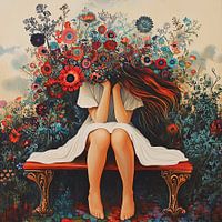 Bloemen Hoofd - Op dit bloemen schilderij zie je een vrouw gezeten op een bankje, haar hoofd en bovenlichaam volledig bedekt door een weelderige, kleurrijke bloemenpracht, tegen een achtergrond van een levendig bloemenveld.