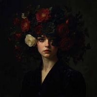 Elegant vrouwenportret versierd met bloeiende bloemen, een mix van zachte schoonheid en natuur, expressieve blik, delicate kleuren, romantische sfeer, artistieke compositie, tijdloze elegantie, vrouwelijke serene gratie.