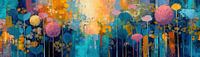 Details: bloemen schilderij, kleurrijke bloemen, abstract schilderij, bloem kunst, blauw, roze, geel, turquoise, moderne kunst, bloemen veld