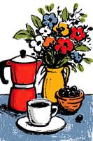 Bloemen Koffie | Bright Morning Vibes - Dit schilderij toont een kleurrijke bloemenvaas met een felrode koffiepot en een schoteltje met een warme kop koffie, wat een gezellige en uitnodigende sfeer in de horeca of keuken oproept.