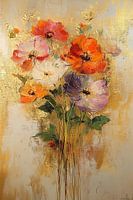 Bloemen Luxe | Golden Bloom - Dit bloemen schilderij toont een levendige verzameling van kleurrijke, textuurrijke bloemen op een gouden achtergrond, waardoor het geheel een luxueuze en elegante uitstraling krijgt.