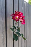 Een roze bloem groeit door een houten hek, altijd naar het licht toe.