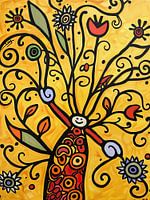 Details: abstract, figuur, bloemen, geel, rood, zwart, grappig, vrolijk, modern, kunst