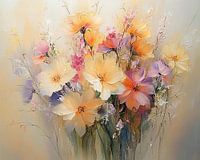 Bloemen Pastel | Pastel Petals - Dit bloemen schilderij toont een levendige verzameling van zacht getextureerde bloemen in pastelkleuren, uiteenlopend van diep oranje tot zacht lila, elk met een dynamisch contrast van licht en schaduw dat een gevoel van diepte en vitaliteit oproept.