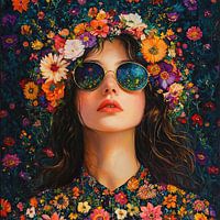 Bloemen Reflectie | Vrouw Kleurrijke Bloemen - Dit is een vrouwen schilderij waarbij de vrouw omringd wordt door een weelde aan kleurrijke bloemen en reflecterende zonnebrillen die een hemel weerspiegelen.