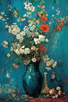 Bloemen Schilderij | Stilleven - Dit levendige stilleven trekt direct de aandacht met zijn overvloedige bloemendetails en rijke kleurenpalet. Het boeket omvat delicate witte en oranje bloemen tegen een intrigerende achtergrond van diep teal blauw, wat een elegant contrast schept. De expressieve penseelstreken en textuur versterken het…