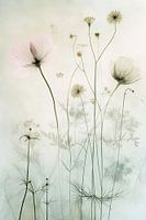 Bloemen Sereniteit - Dit bloemen schilderij toont een serene samenstelling van lange, delicate bloemen en zaden op hoge, dunne stelen, uitgevoerd in zachte groene en witte tinten die rust en natuurlijke schoonheid benadrukken.