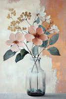 Bloemen | Serenity Blossom - Dit bloemen schilderij toont een elegante compositie van bloemen in zachte roze en witte tinten, geplaatst in een transparante glazen vaas op een verweerd oppervlak, waarbij de subtiele textures en kleurschakeringen een serene sfeer oproepen.