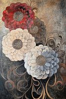 Bloemen | Sierlijke Bloemen Donkere Achtergrond - Op dit bloemen schilderij zie je grote, sierlijke bloemen in een palet van rood, wit en bruin, op een donkere, textuurrijke achtergrond met elegante, krullende lijnen en een subtiel gevoel van beweging.