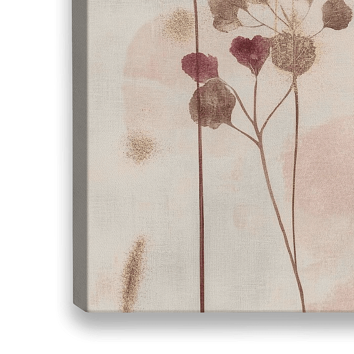 Bloemen | Soft Whisper Petals - Dit bloemen schilderij toont sierlijke silhouetten van bloemen tegen een zachte achtergrond met roze en goudkleurige tinten die een etherische en rustige sfeer creëren.