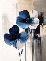 Bloemen | Urban Blossom - Dit bloemen schilderij toont twee grote, gestileerde bloemen, één in levendig blauw en de andere in een combinatie van wit en blauw, tegen een achtergrond van abstracte, neutrale tinten met dominante verticale en horizontale penseelstreken.