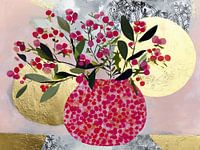 Bloemen Vaas | Berry Vibes - Dit bloemen schilderij toont een levendige vaas gevuld met bloeiende takken en felgekleurde bessen, tegen een achtergrond van gouden cirkels en subtiele patronen die samen een moderne uitstraling creëren.