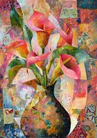 Bloemen Vaas | Colorful Floral Harmony Today - Dit bloemen schilderij toont een elegante vaas met kleurrijke lelies in verschillende tinten roze en groen, waarbij de achtergrond gevuld is met dynamische patronen en texturen die een moderne sfeer creëren.