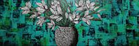 Bloemen Vaas | Floral Vibes - Dit bloemen schilderij toont een stijlvolle vaas met elegant gevormde witte bloemen die contrasteren met een levendige turquoise achtergrond, perfect voor een fris en modern interieur.