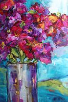 Bloemen Vaas | Vibrant Blossoms in Modern Vase - Dit bloemen schilderij toont een kleurrijke vaas vol met intense, paars-roze bloemen die levendig contrasteren met een blauwe achtergrond, wat een vrolijke en moderne uitstraling geeft aan elke ruimte.